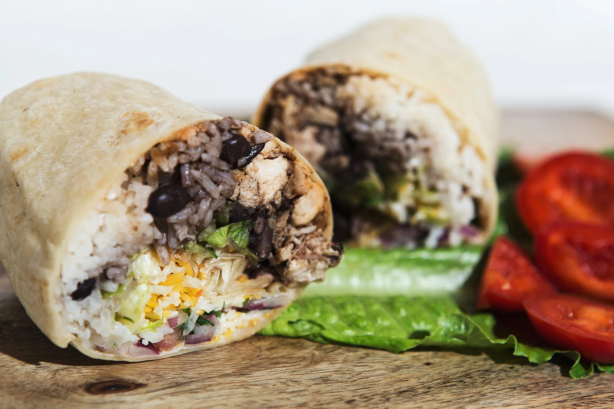 Flour tortilla filled with pulled chicken, white rice, black beans, lettuce, guacamole, sour cream, pico de gallo, monterey jack and cheddar cheese